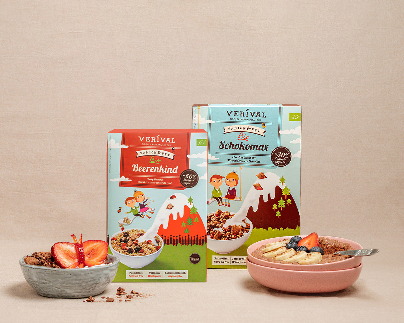 Delicious granola for children with 30-50% less sugar than conventional breakfast cereals