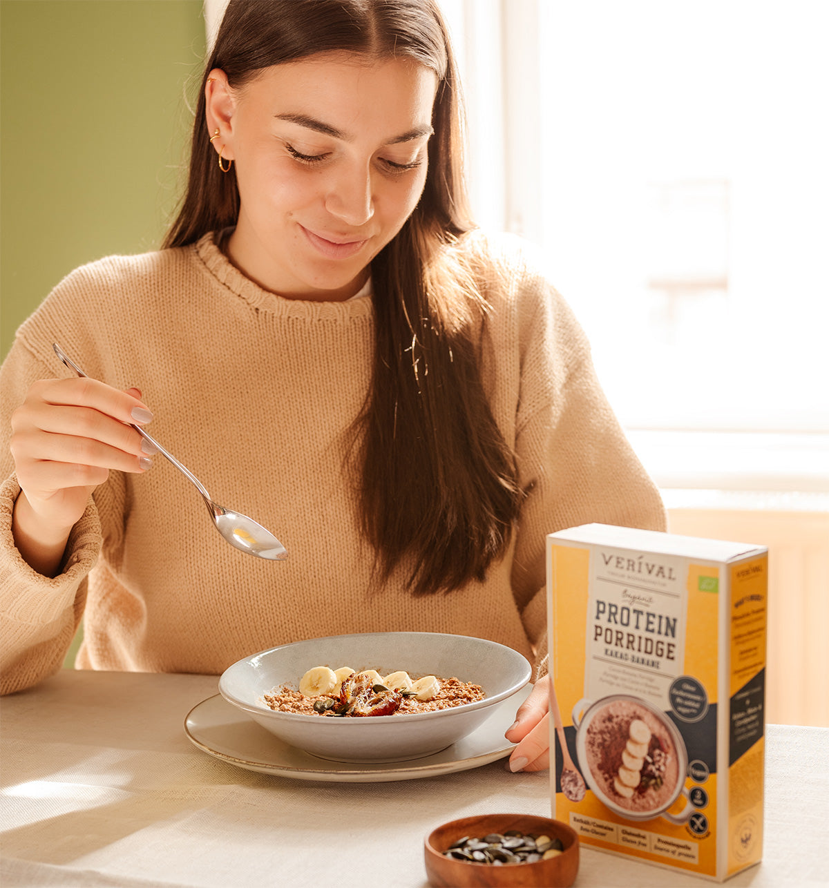 As with training, variety is also extremely important when it comes to nutrition. You can eat your Verival porridge exotic, savoury or sweet. This means you'll always have variety in your healthy breakfast and never get bored. Buy and enjoy porridge and find more ideas and recipes in our blog! Click through and find your sports porridge recipe. Simply buy porridge now and enjoy it every morning or before your workout.