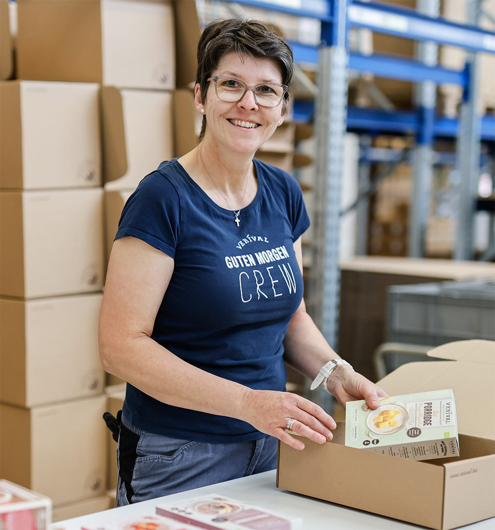 Unser Lagerteam verpackt deine Bestellungen liebevoll von Hand und sorgt dafür, dass deine Verival-Produkte so schnell wie möglich auf deinem Frühstückstisch landen.