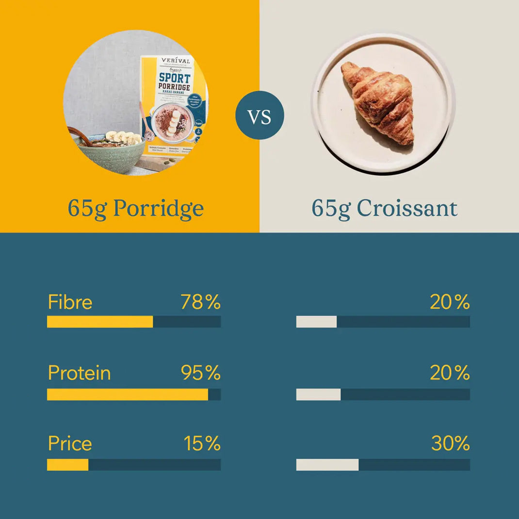 Nutrient density is the ratio of nutrients to calories contained in a food. The more nutrients a food has per calorie, the greater its nutrient density. Porridge contains five times as much fibre as a croissant.