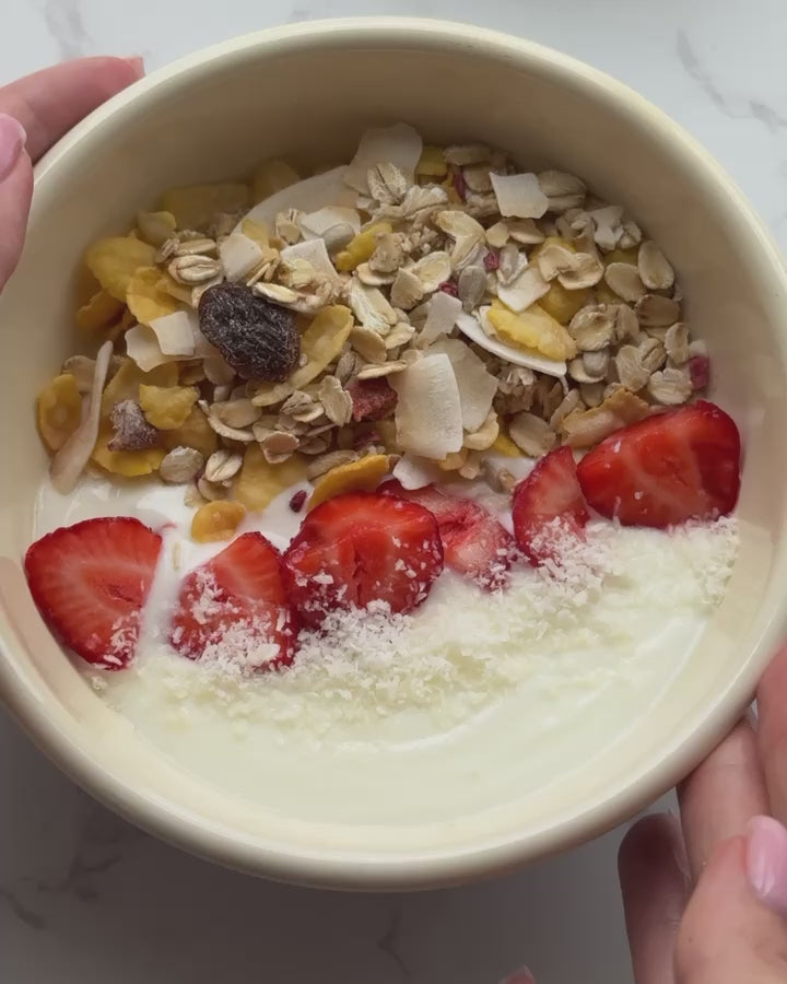 Pour fresh milk or plant-based drink over muesli, mix with yoghurt or use as a topping.