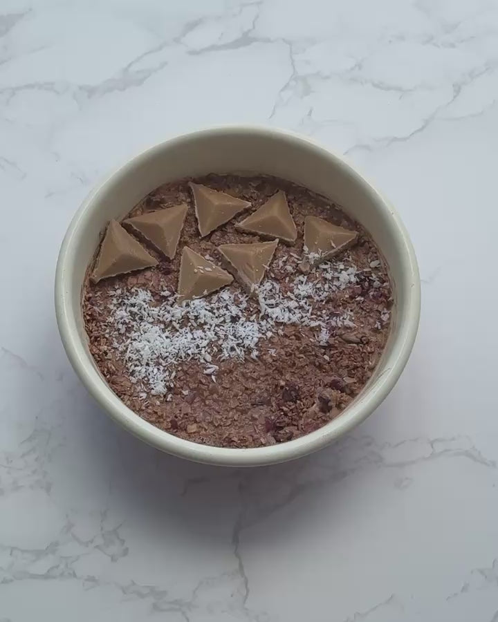 Pour 95ml of boiling water or 95ml of hot oat drink (depending on the desired thickness) over 50g of the basic mixture (6 tablespoons) in a bowl, stir, leave to swell for 3 minutes and enjoy warm.